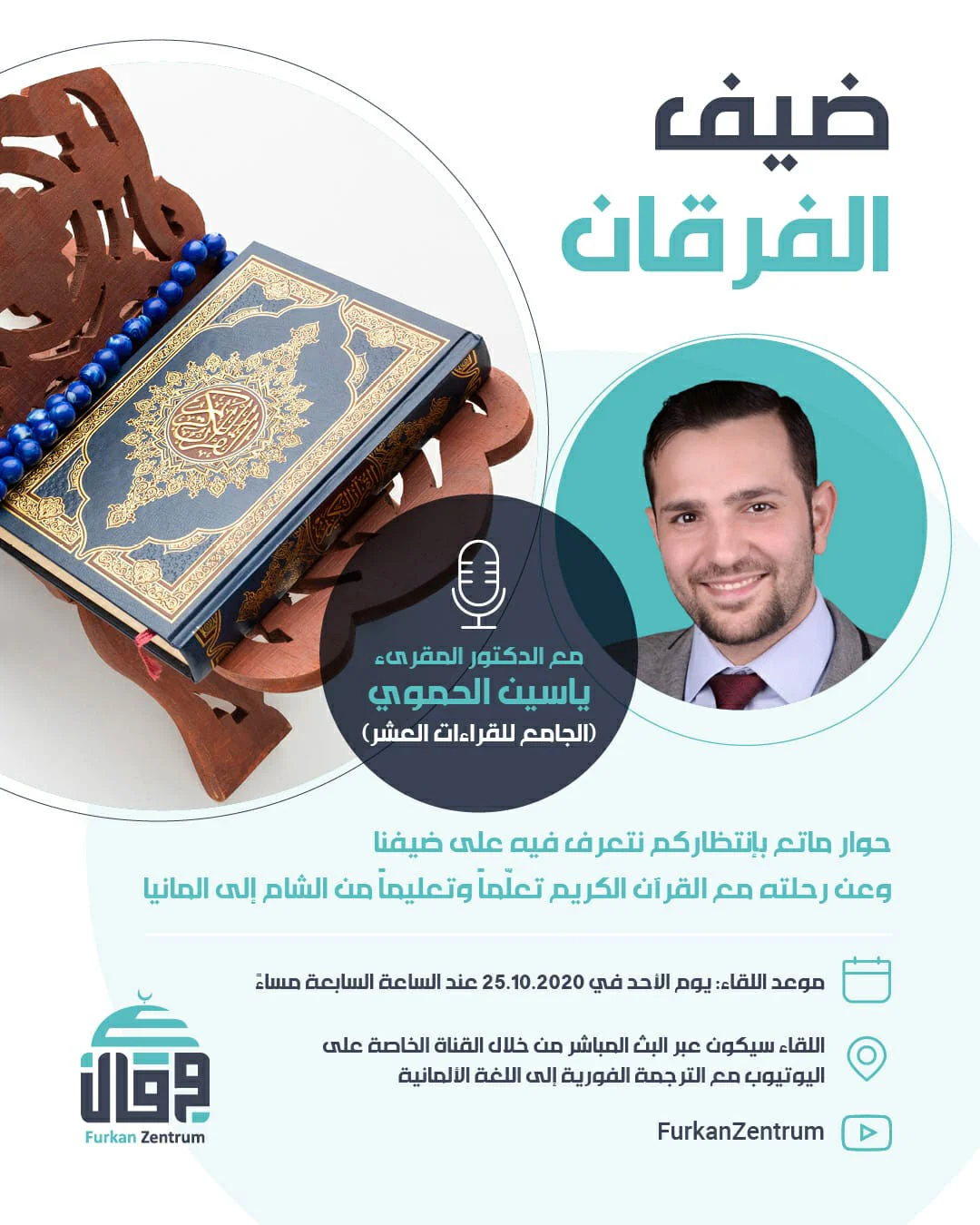 Hierbei handelte es sich um einen bereichernden Dialog über den spannenden Werdegang unseres ehrenwerten Gastes Sheikh Dr. Yasin Al-Hamawi. Er berichtete uns von seiner segensreichen Reise mit dem edlen Koran und seiner Tätigkeit als Koran-Lehrer in Syrien und Deutschland.